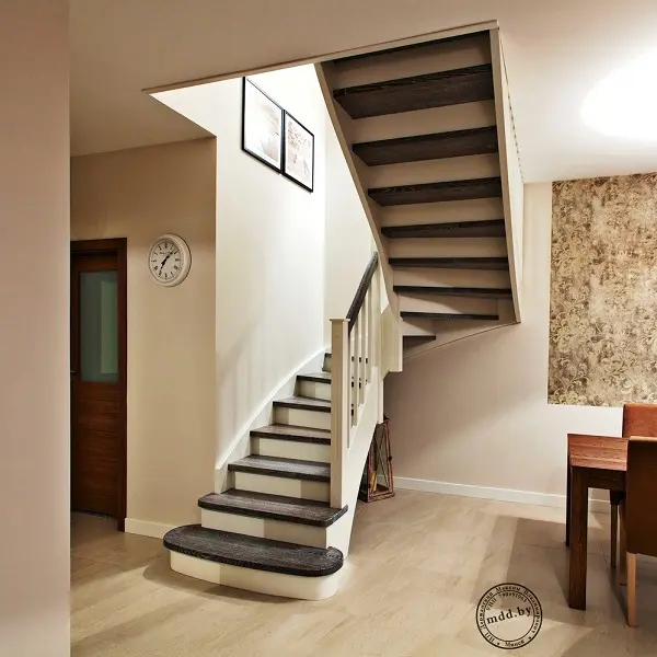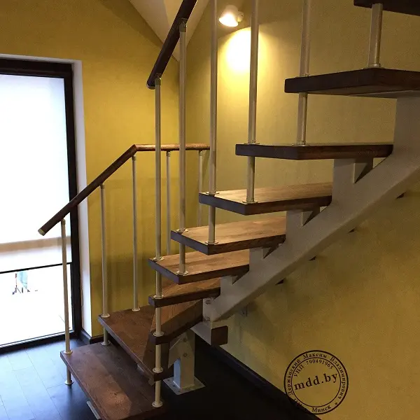Подступени зарезаны и установлены под углом. Места крепления ступени и подступени дополнительно изнутри усилены металлическими уголками. Покрытие: экологичные немецкие паркетные масла OSMO с твердым воском.