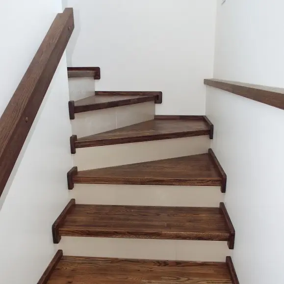 Облицовка бетонных ступеней дубом (двухслойный подобранный цельноламельный дубовый щит сорта А/В мебельной влажности (8-10%)), с дополнительным усилением.