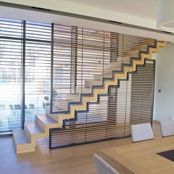 Данная облицовка проводилась двухслойным дубовым щитом мебельной влажности. За счет комбинирования одного цельноламельного слоя сорта А/В и сращенного слоя сорта С/В удалось добиться значительной экономии в цене и увеличения стабильности ступеней.