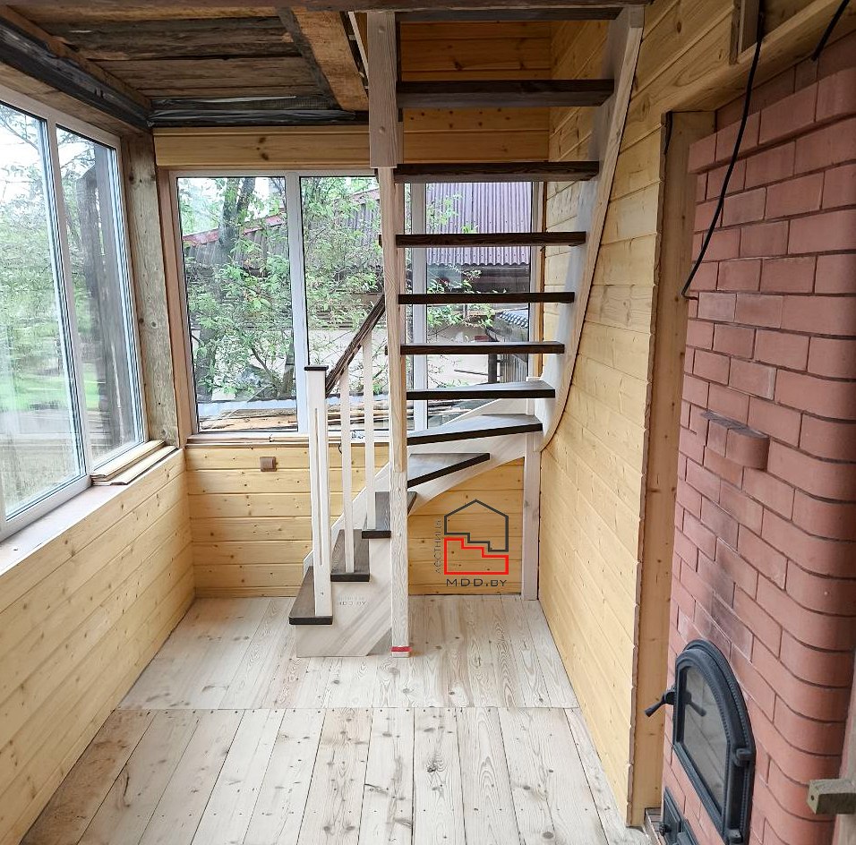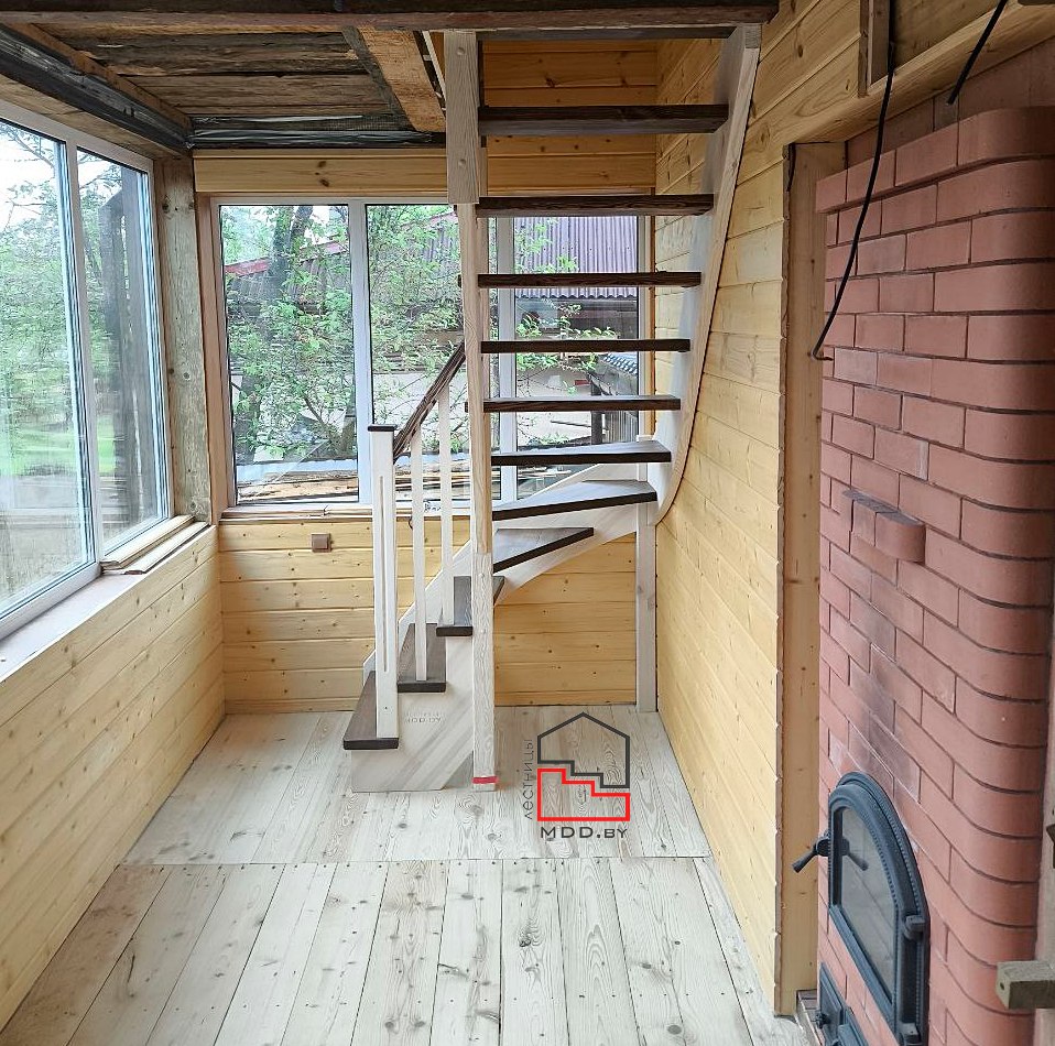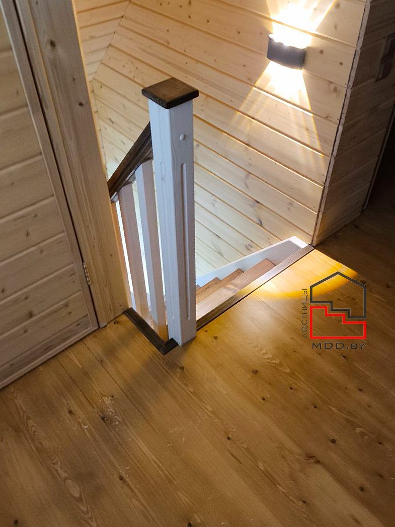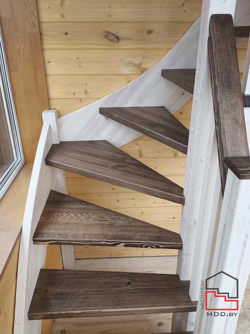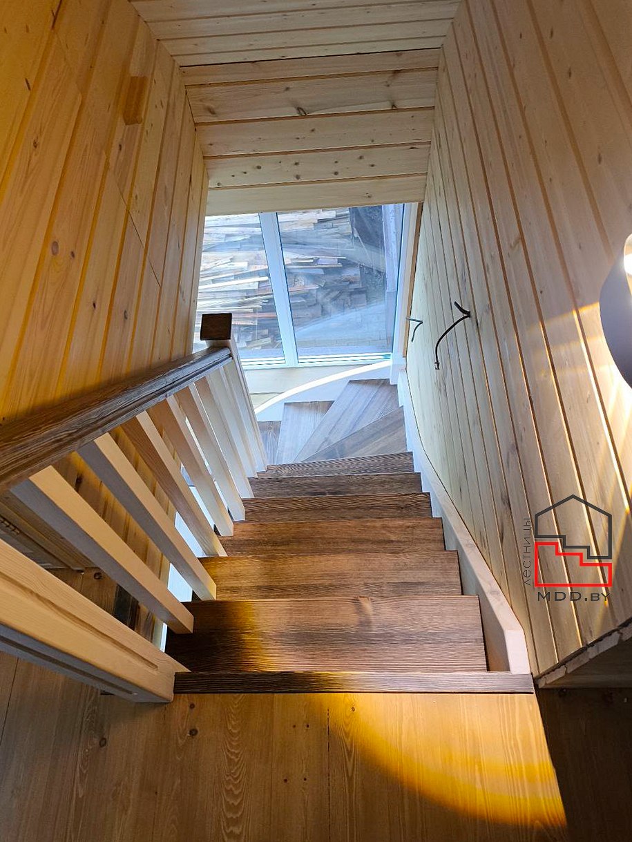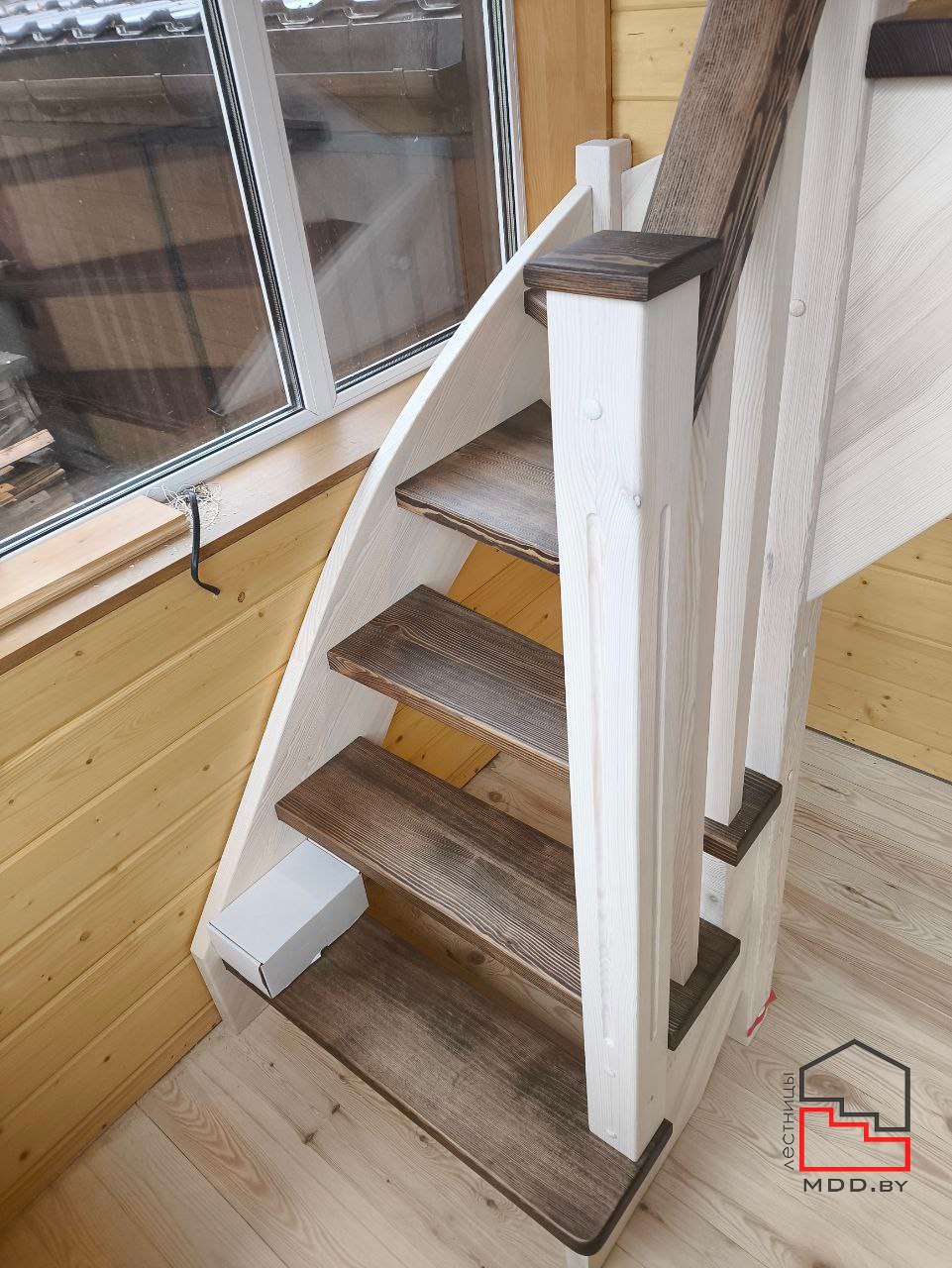 Г-образная лестница из сосны с сучками полного цикла производства.